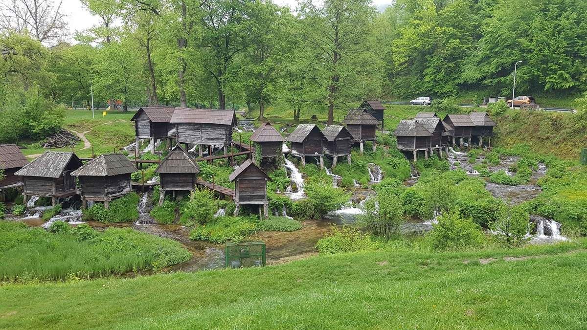 Premier arrêt rapide au centre ville de Jajce pour y voir ses cascades et récupérer une carte SIM de BH mobile et retirer des marks (1 euro est égal à 1.95 mark) … sous la pluie. Nous repartons vite vers le lac pour stationner à coté d’une rivière avec des petites maisons en bois. Super sympa !